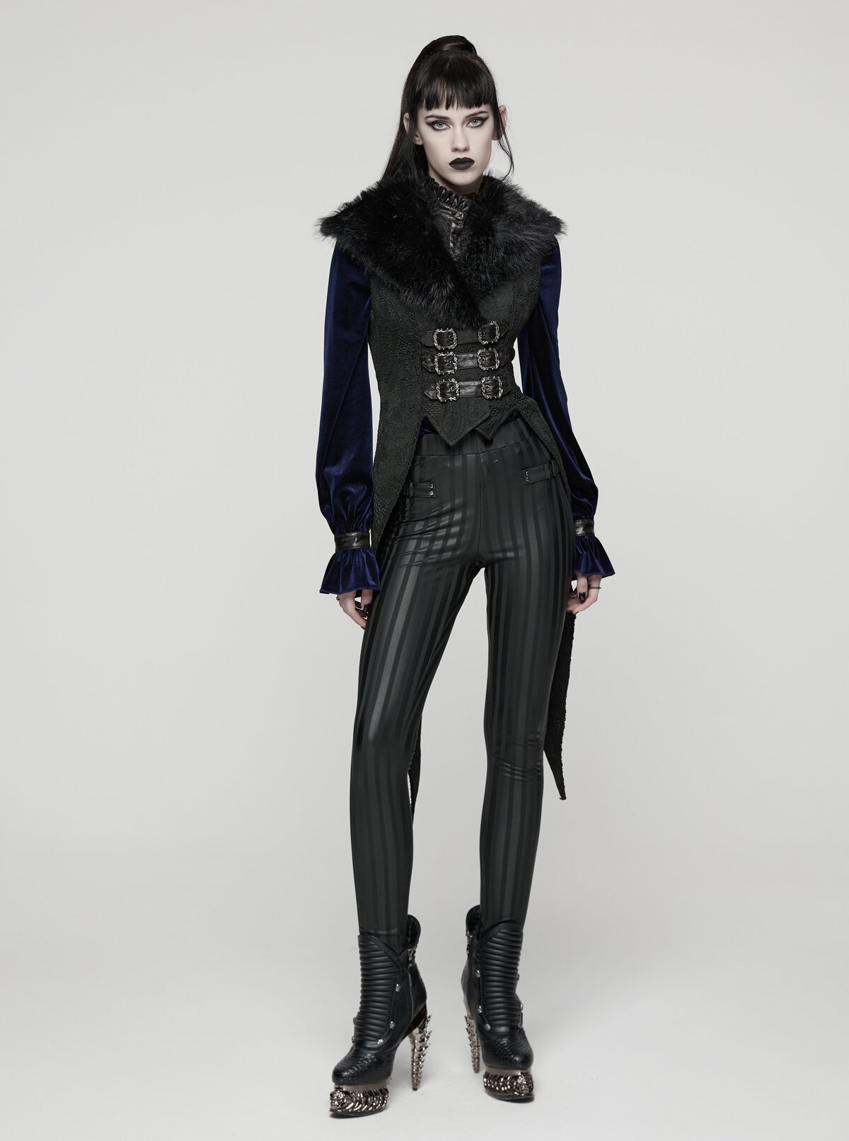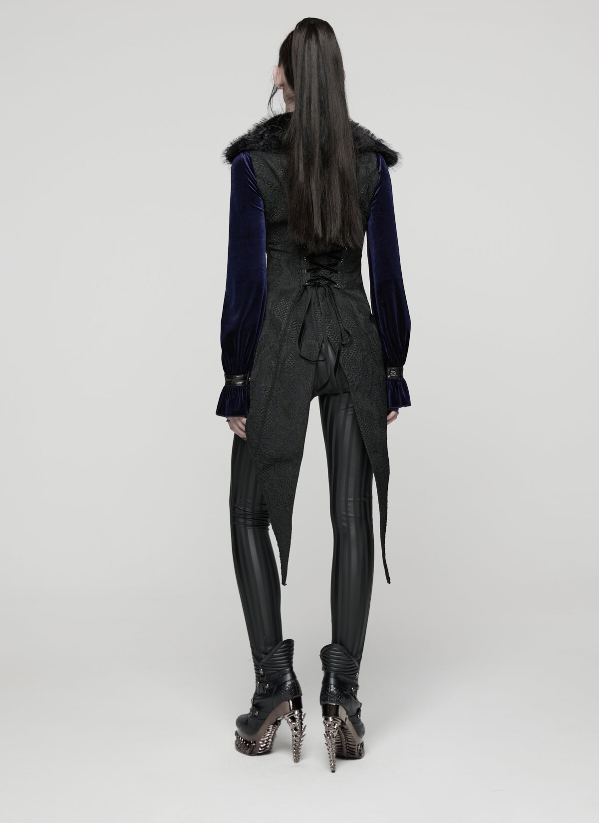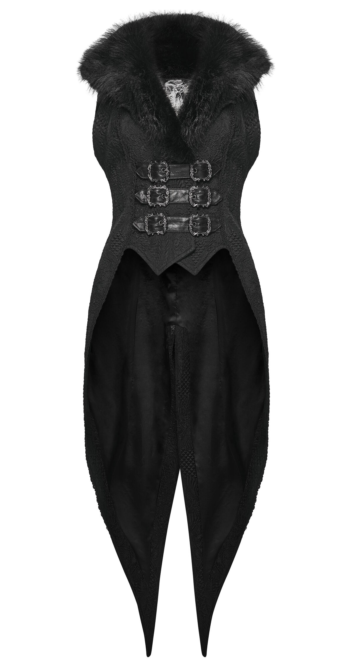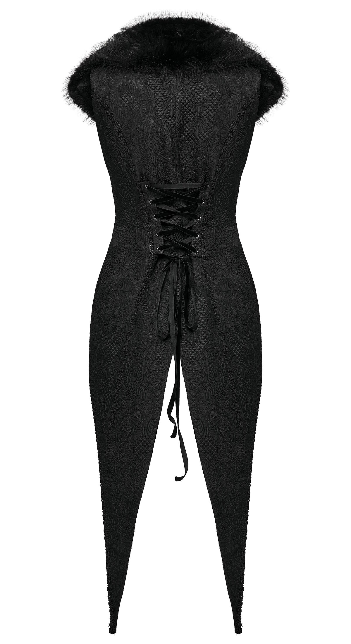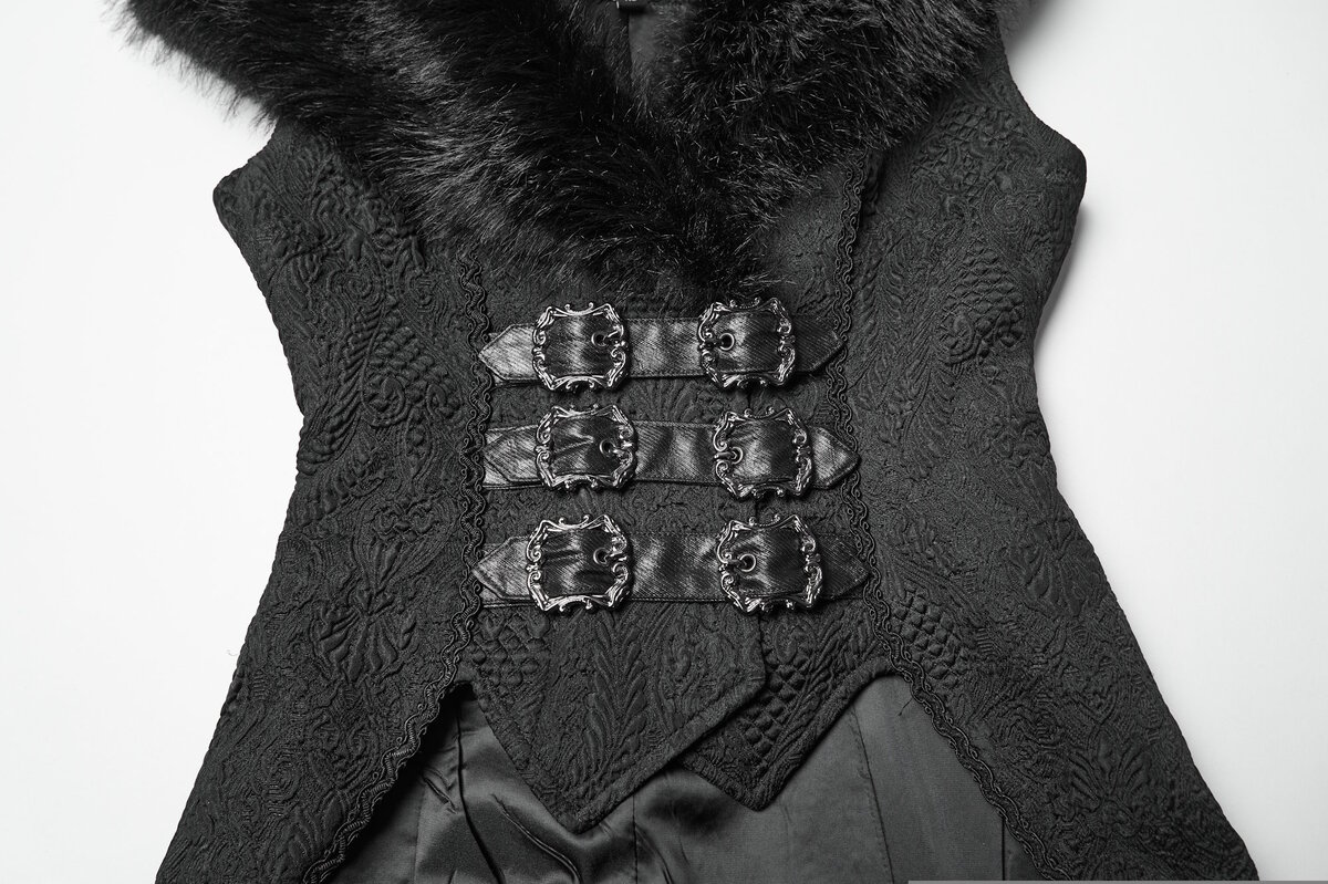 Inspiré du smoking victorien, ce gilet Punk Rave combine un jacquard noir somptueux à un large col en fausse fourrure qui encadre le visage avec majesté.