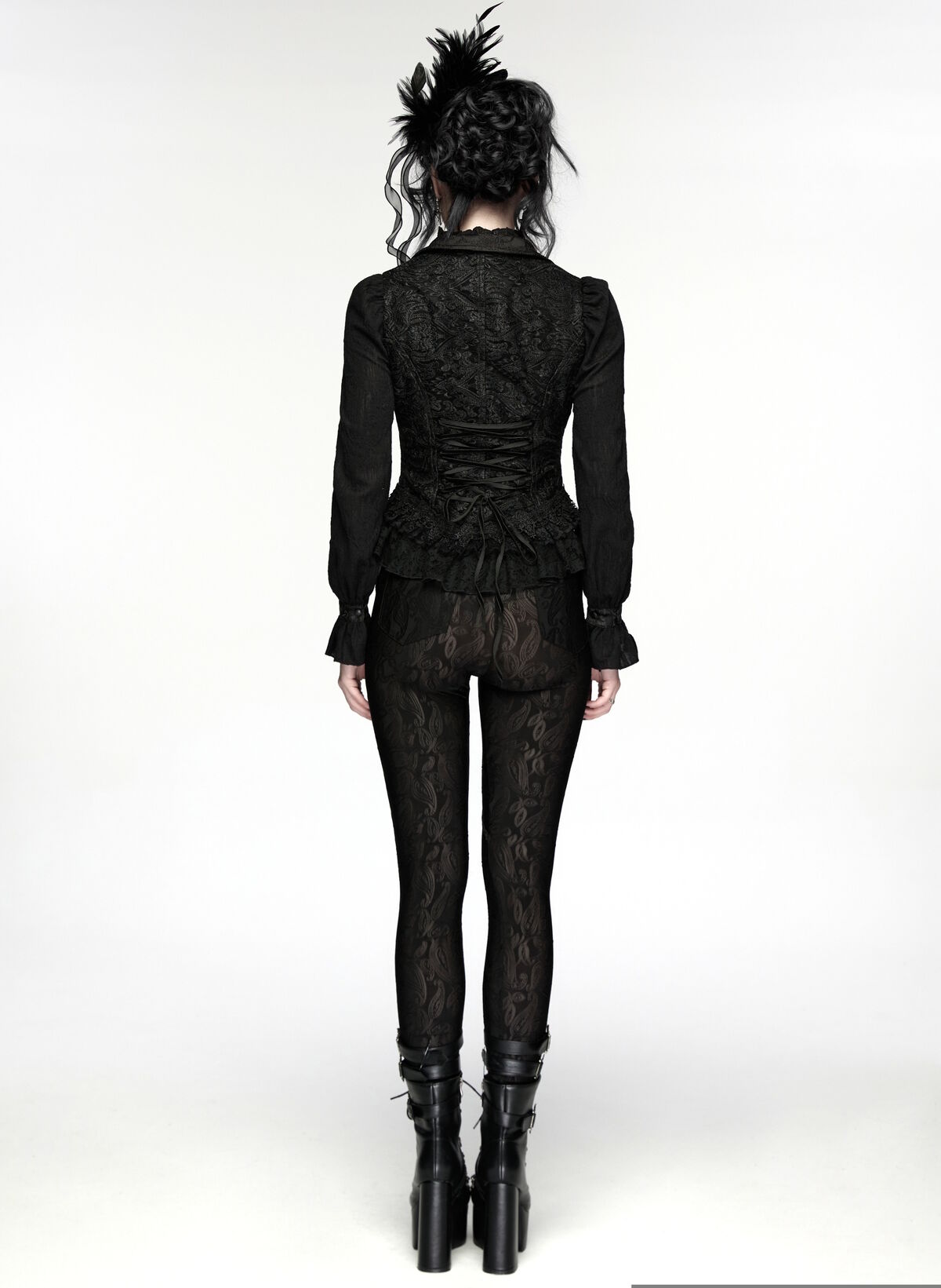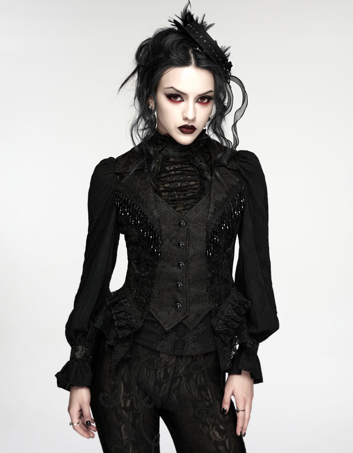 Associe-le à un pantalon ajusté pour un look moderne ou une jupe longue pour renforcer l’effet gothique romantique.