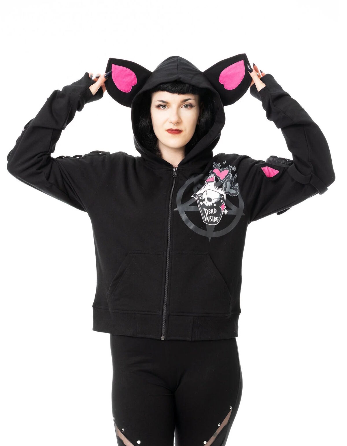 Sa capuche est ornée de grandes oreilles doublées de rose vif, tandis que le dos arbore deux ailes stylisées et des coeurs contrastés. Sur la poitrine comme sur les manches, un univers graphique se déploie : crânes cartoon, croix, patchs, poisons et symboles punk kawaii.