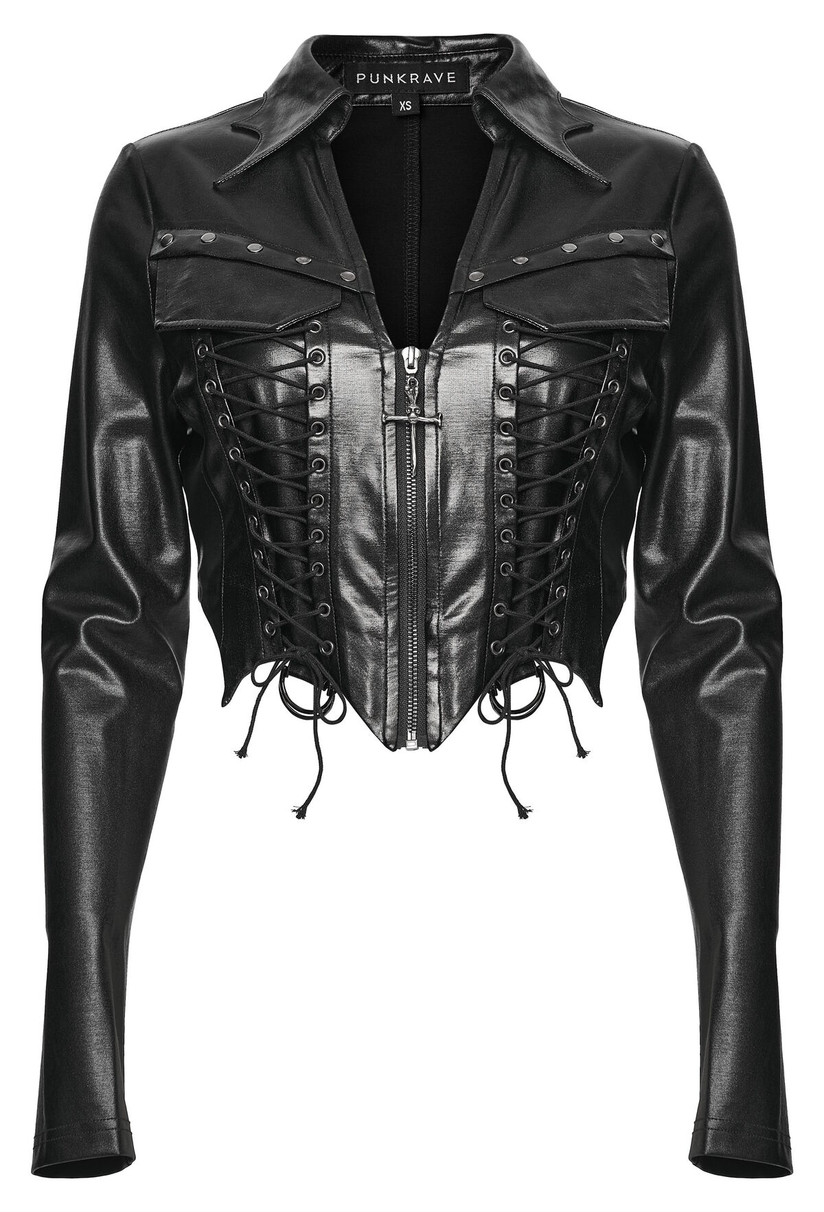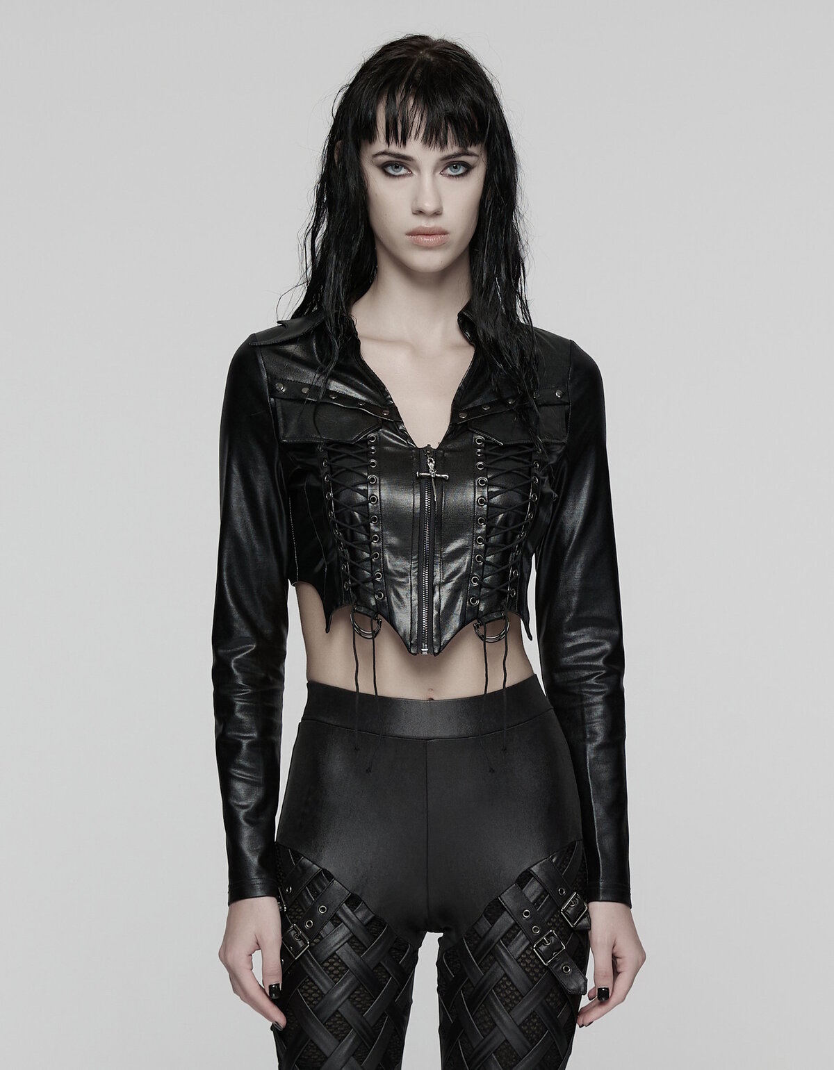 Sa fermeture zippée, ses lacets sur le buste et les côtés et ses détails métalliques (oeillets, clous, pendentifs crânes) ajoutent une dimension dramatique, tandis que le col façon ailes de chauve-souris et les lanières ajustables au dos soulignent une silhouette audacieuse et sculptée.
