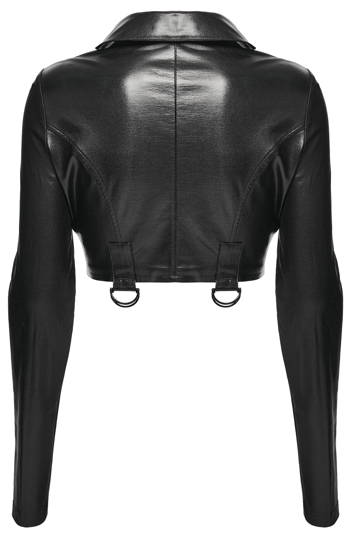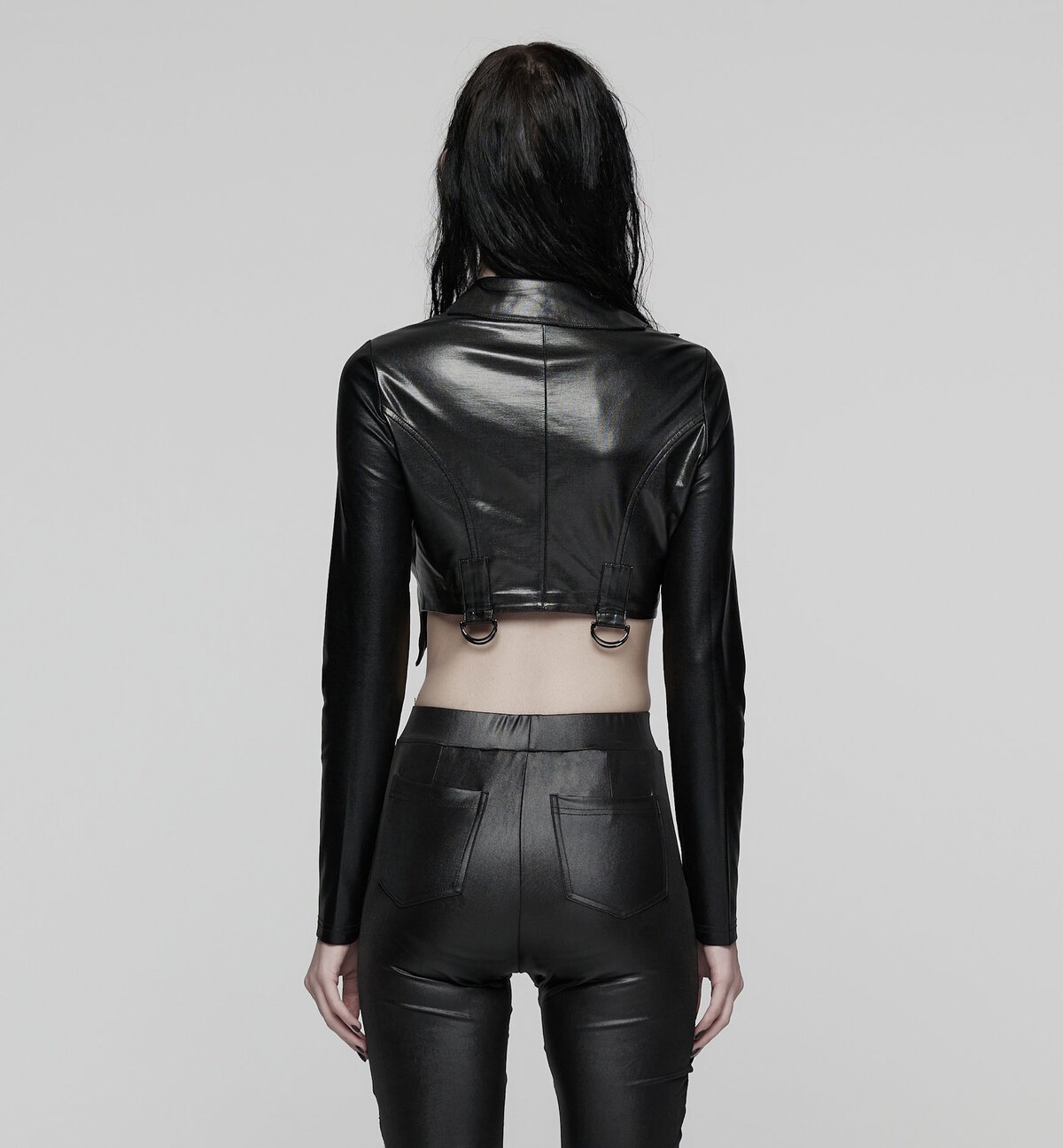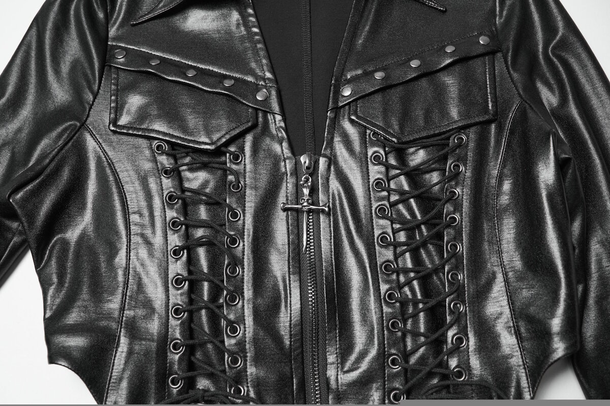 Sombre, sensuelle et résolument punk, la veste « Black Venom » est une pièce forte de la collection Punk Rave. Conçue dans un tissu look cuir noir brillant à l’aspect texturé, elle associe une coupe ajustée à une esthétique alternative ultra-soignée.