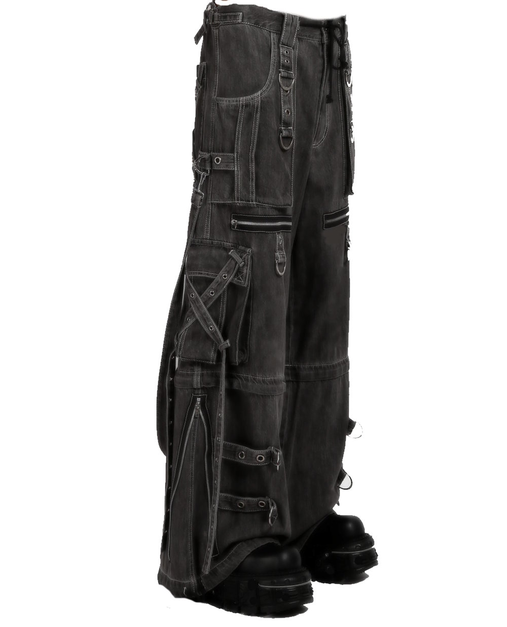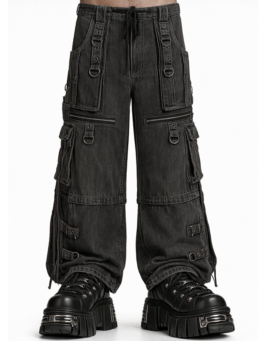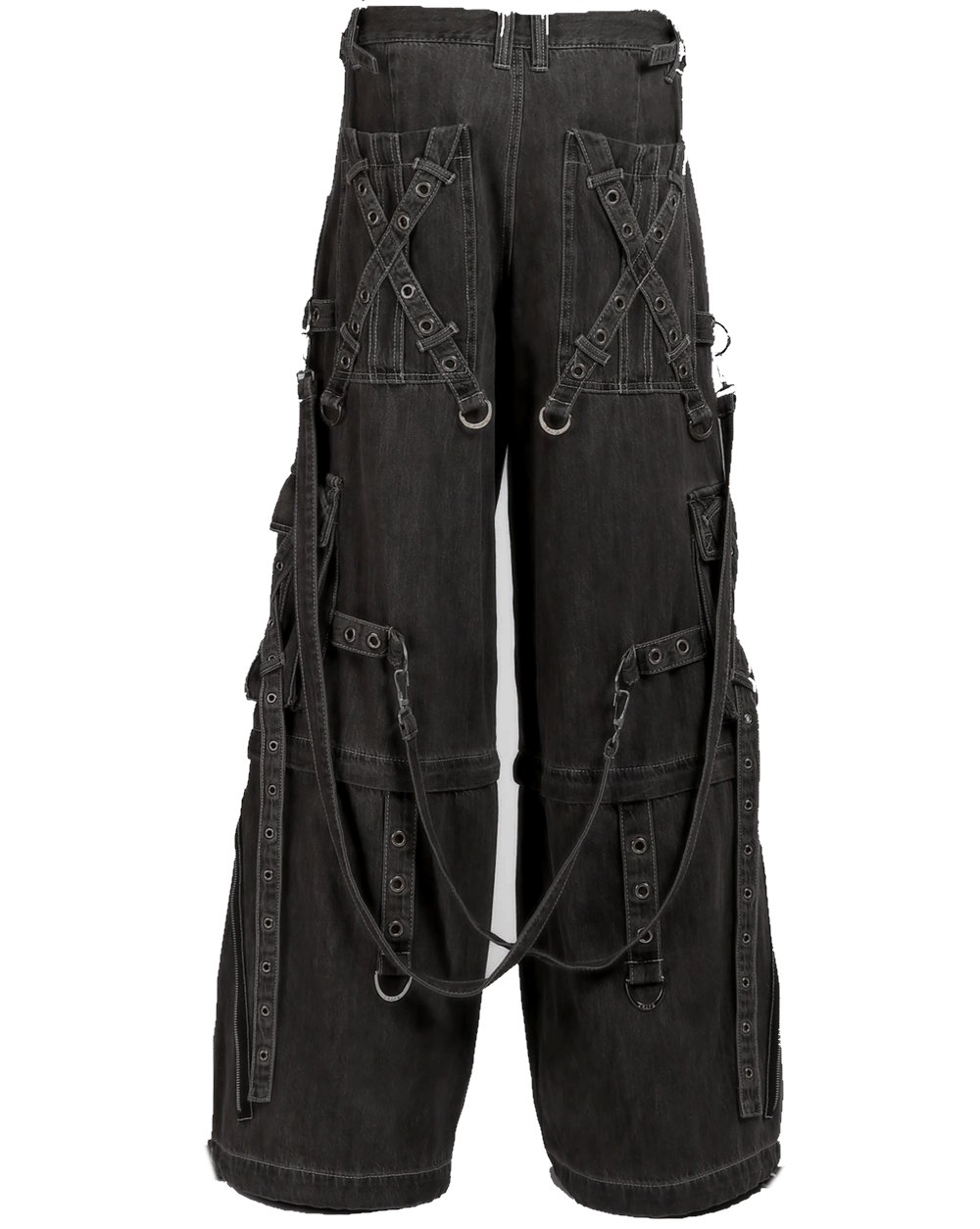 Ses fermetures éclair dissimulées permettent de le transformer en bermuda en quelques secondes, faisant de lui un allié aussi pratique que stylé. Le jeu de sangles, d’anneaux métalliques et d’oeillets lui confère une esthétique profondément darkwear, évoquant les silhouettes industrielles qui hantent les scènes alternatives.