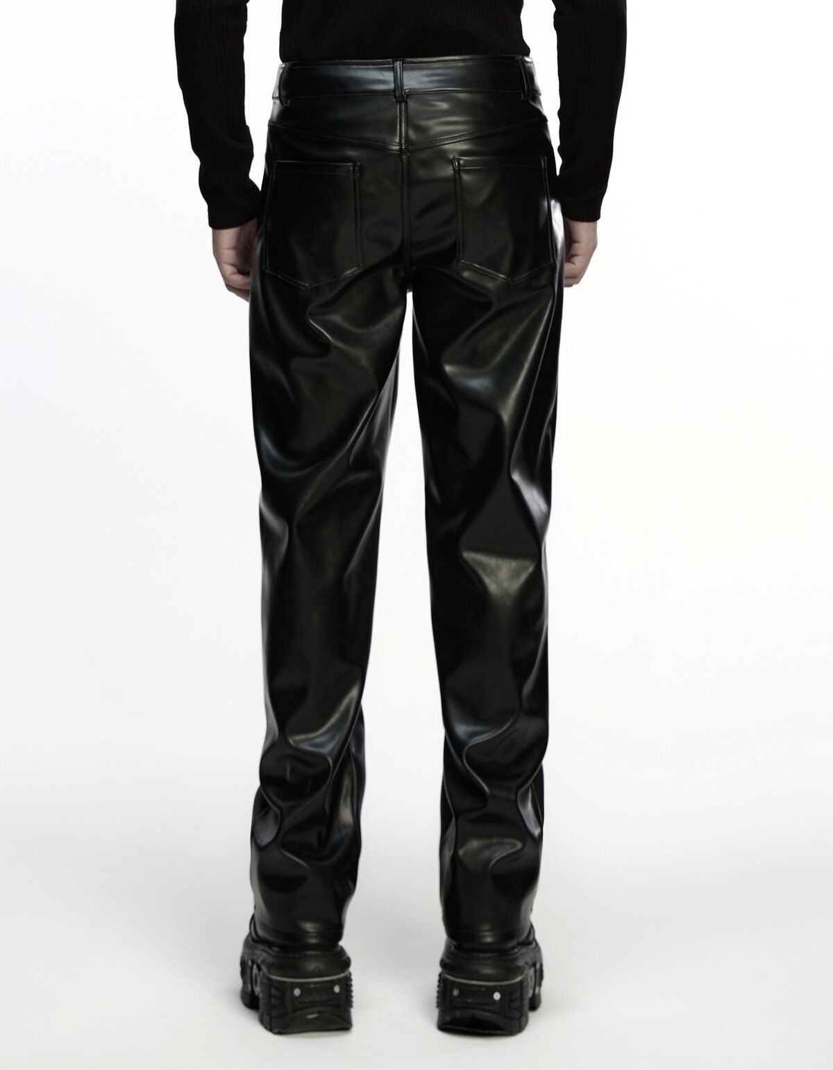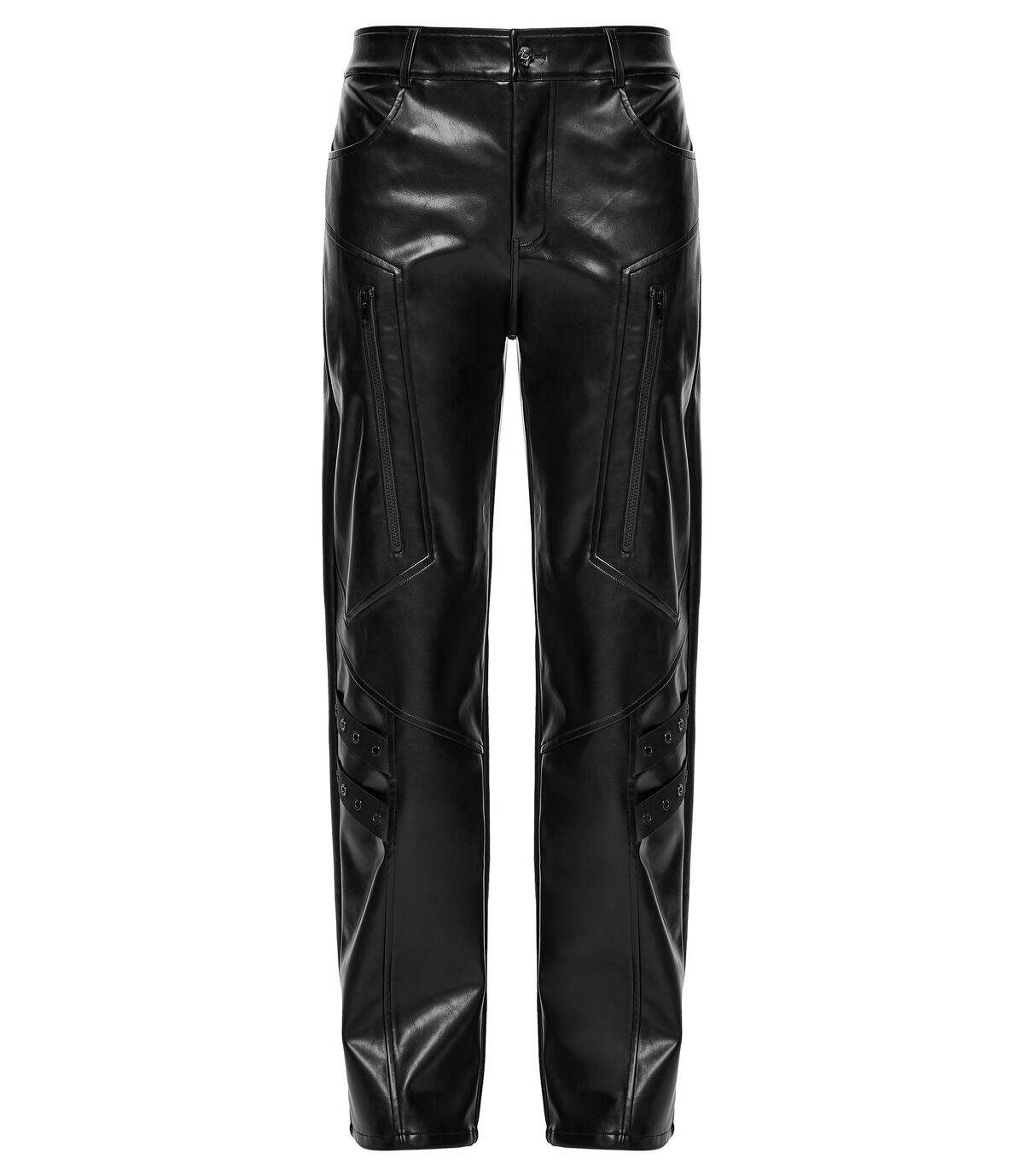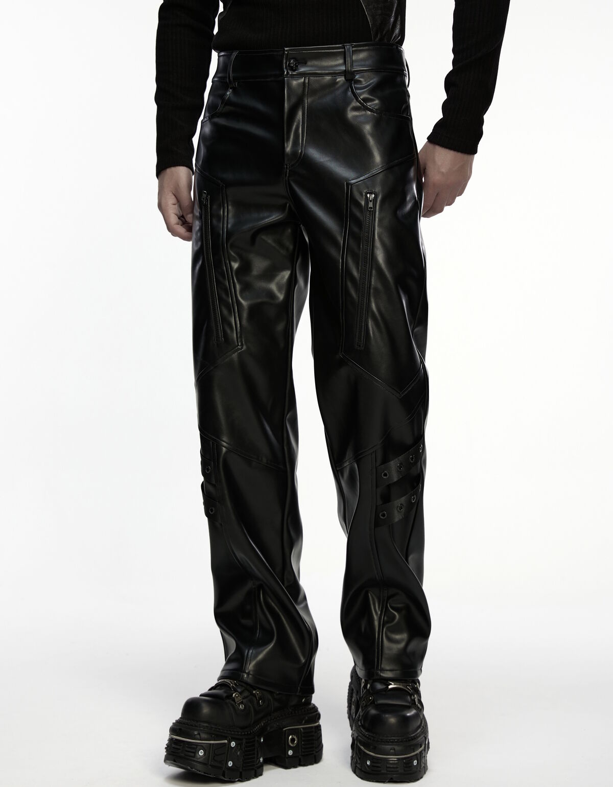 Ses lignes nettes et ses découpes géométriques redessinent la jambe avec précision, tandis que sa matière effet cuir capte la lumière pour mieux la renvoyer dans l’obscurité.