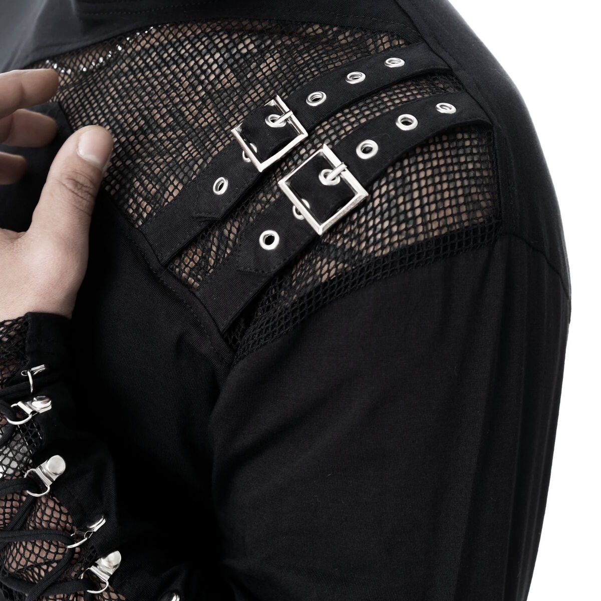 Sa base en coton noir mat contraste subtilement avec les zones en résille, révélant la peau sans jamais trop en dire. Les manches lacées, renforcées par des oeillets métalliques, apportent une tension visuelle puissante, presque rituelle.