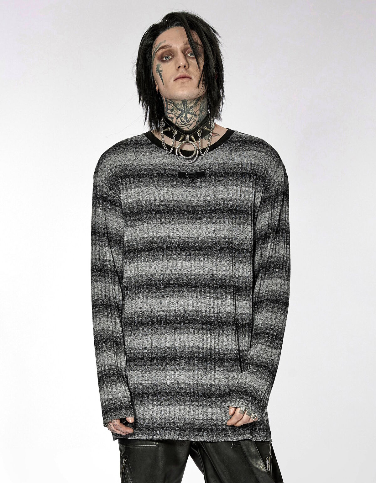 Affirmez votre style ténébreux avec le pull rayé gothique Punk Rave . Conçu dans un tissu léger et confortable, ce modèle associe les teintes grises et noires pour une allure sombre et élégante.