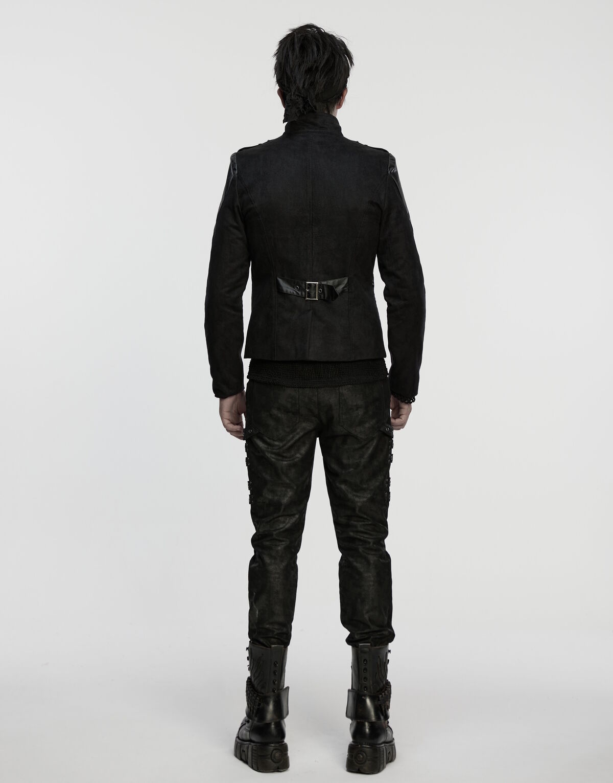Son jeu de matières - suédé, textile rayé texturé et finitions cuir vegan - crée une profondeur visuelle marquée, tandis que les oeillets métalliques et les épaulettes évoquent une esthétique punk industriel et post-apo.