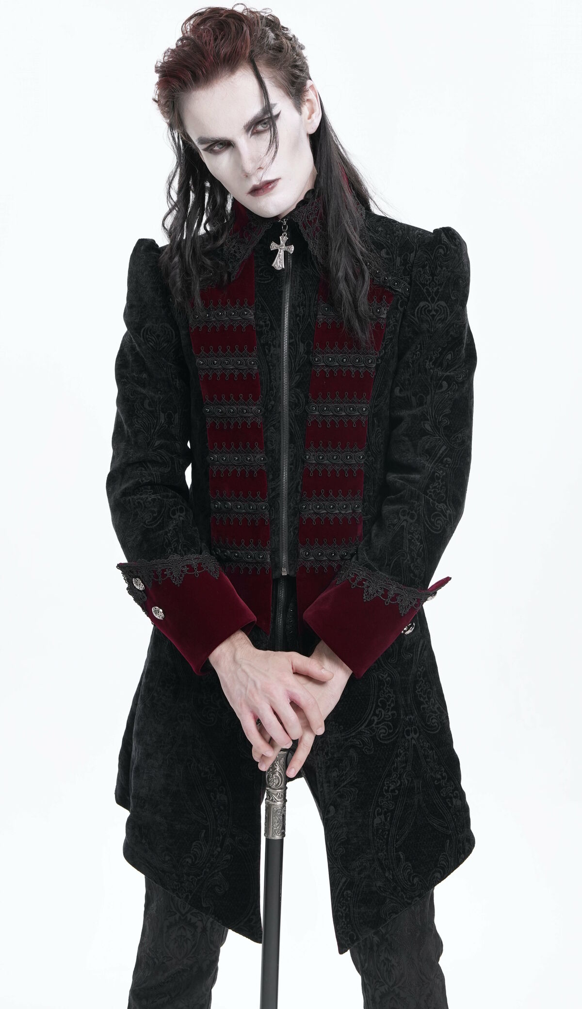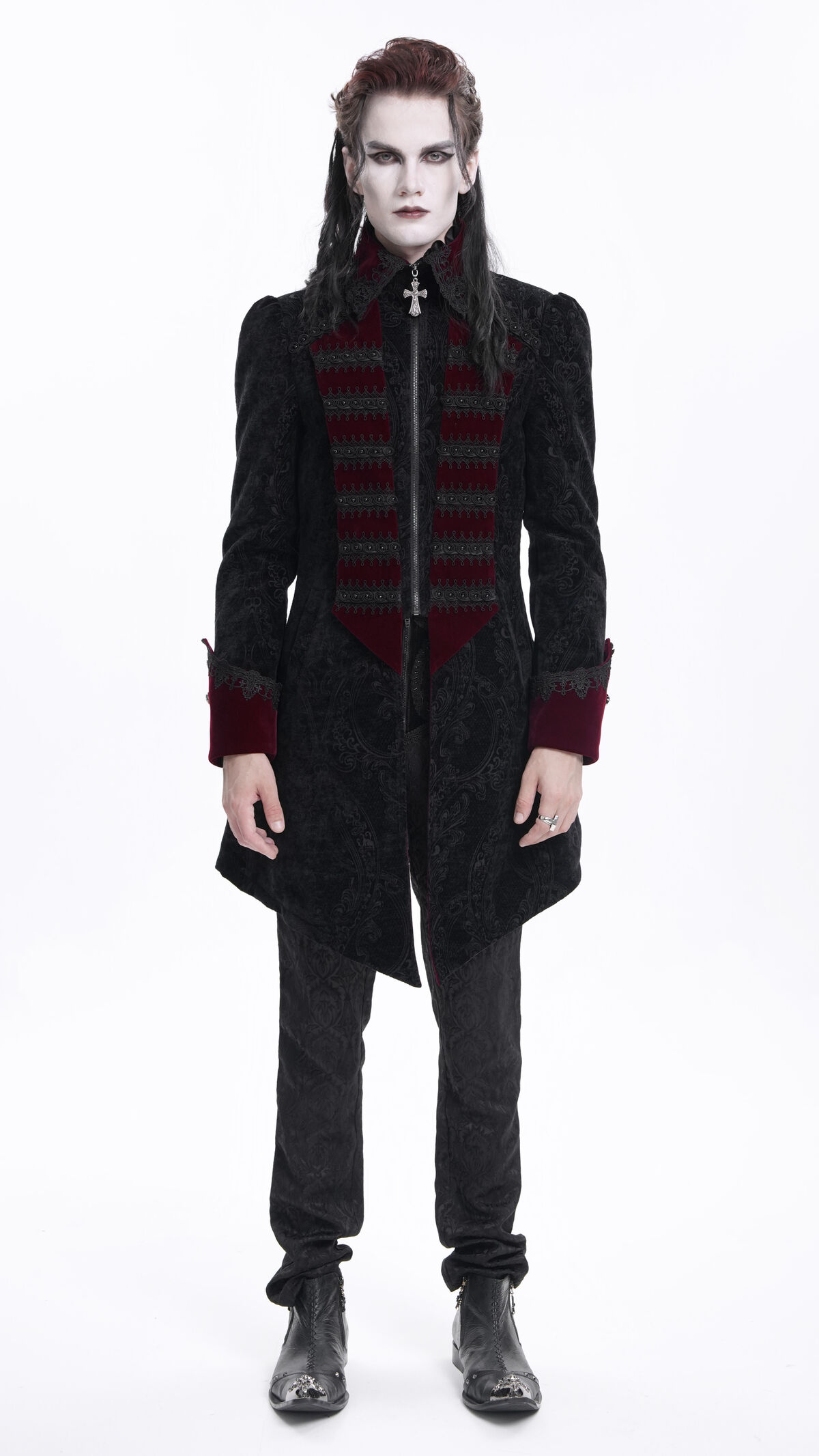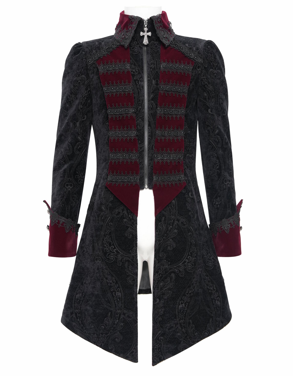 Plongez dans l’élégance d’une autre époque avec cette veste gothique baroque d’inspiration victorienne. Confectionnée dans un somptueux velours noir aux motifs en relief, elle est rehaussée de détails en velours bordeaux profond, de galons brodés et d’une croix argentée ornant le col, symbole de noblesse et de mystère.