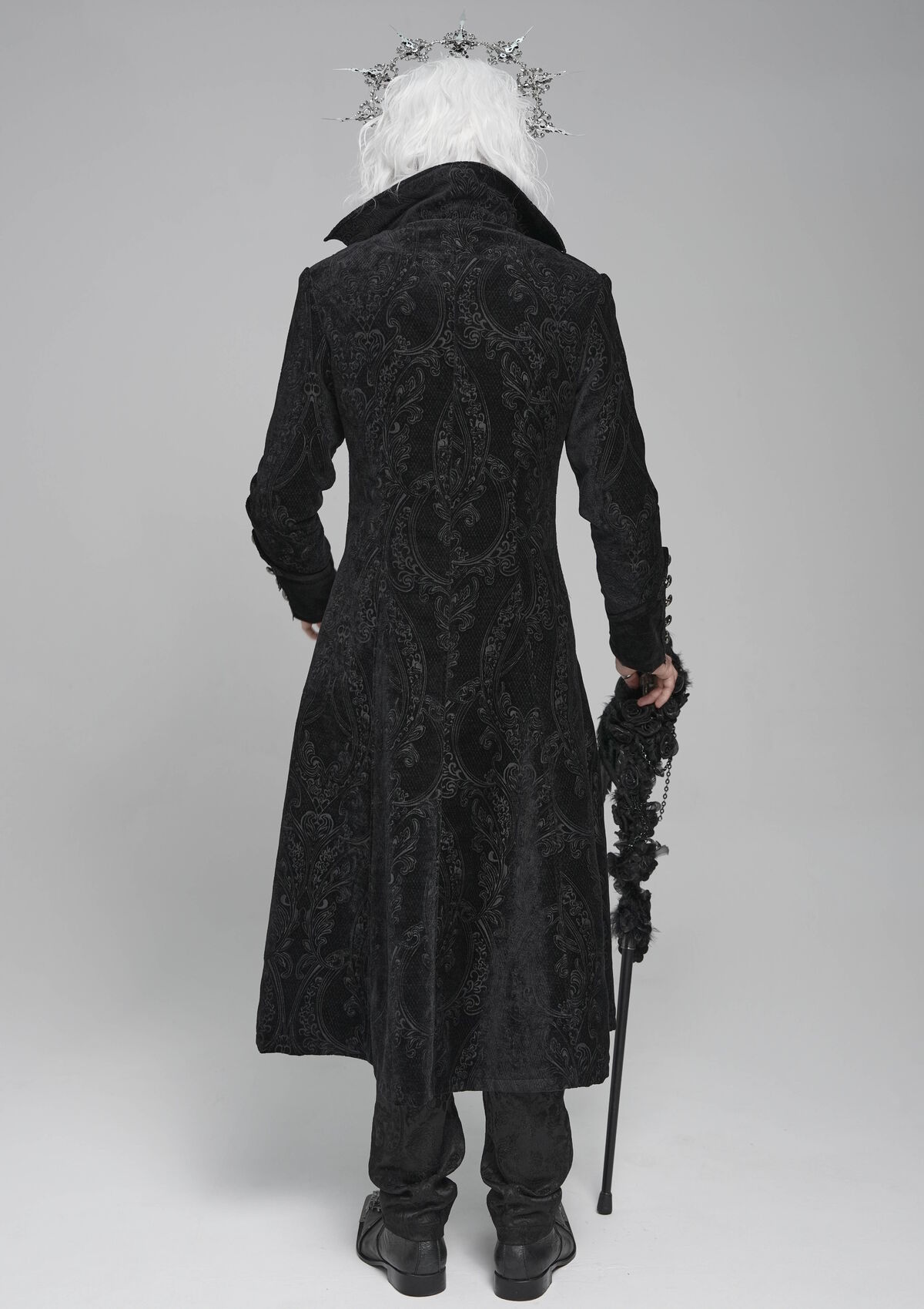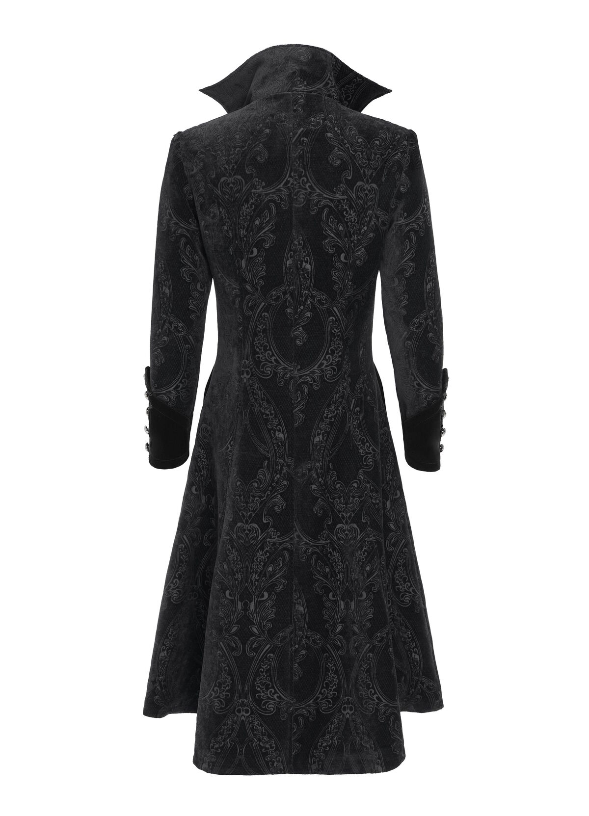 Son velours dévoré dessine des motifs profonds, presque gravés dans l’ombre, tandis que les lignes cloutées rythment le torse comme une armure cérémonielle. Le col montant encadre le port de tête avec autorité ; les poignets larges et la dentelle ajoutent une sophistication funèbre.