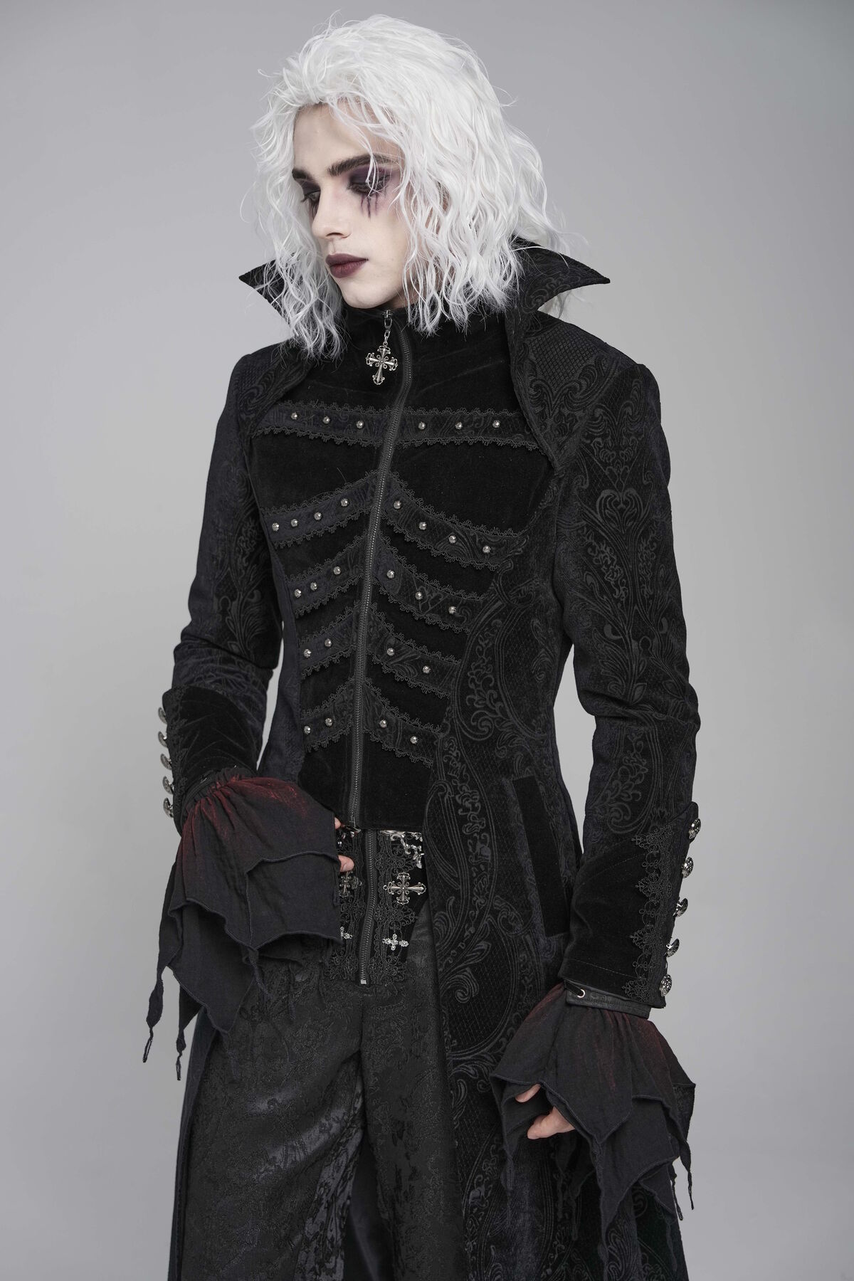 Pensée pour l’homme gothique moderne - seigneur nocturne, dandy sombre ou chef d’orchestre des ténèbres - cette veste transforme chaque entrée en déclaration.